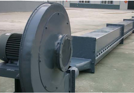 空氣輸送斜槽工作原理:以高壓離心風機(9-19:9-26)為動力源,使密閉輸送斜槽中的物料保持流態化向傾斜向下的一端緩慢的流動。